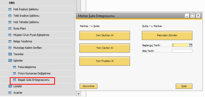 FATURALARIN MERKEZE GÖNDERİLMESİ MENÜSÜ